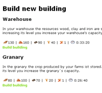 A warehouse and a granary enable you to store more resources. A cranny saves your resources from getting stolen by enemy raiders. |